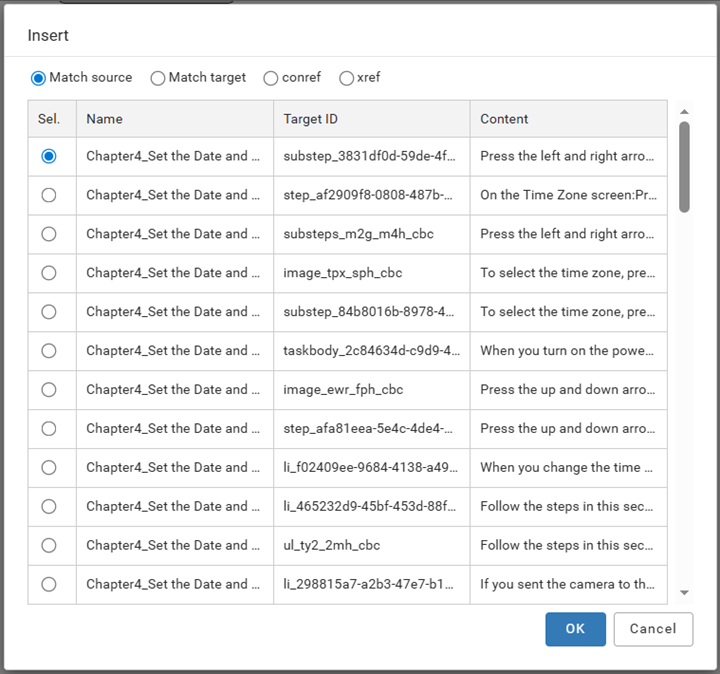 Use the Target ID to make sure you're inserting an element that matches the element you're editing in the Oxygen editor. For example, if you want to insert the content from a substep, make sure that in the Oxygen editor your cursor is in an ordered list's substep element.