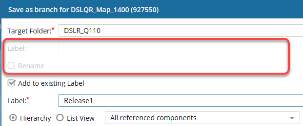 - If you select Add to existing Label, the Rename checkbox and the Label entry field options are no longer available. Instead, you must select the Label of an existing branch.