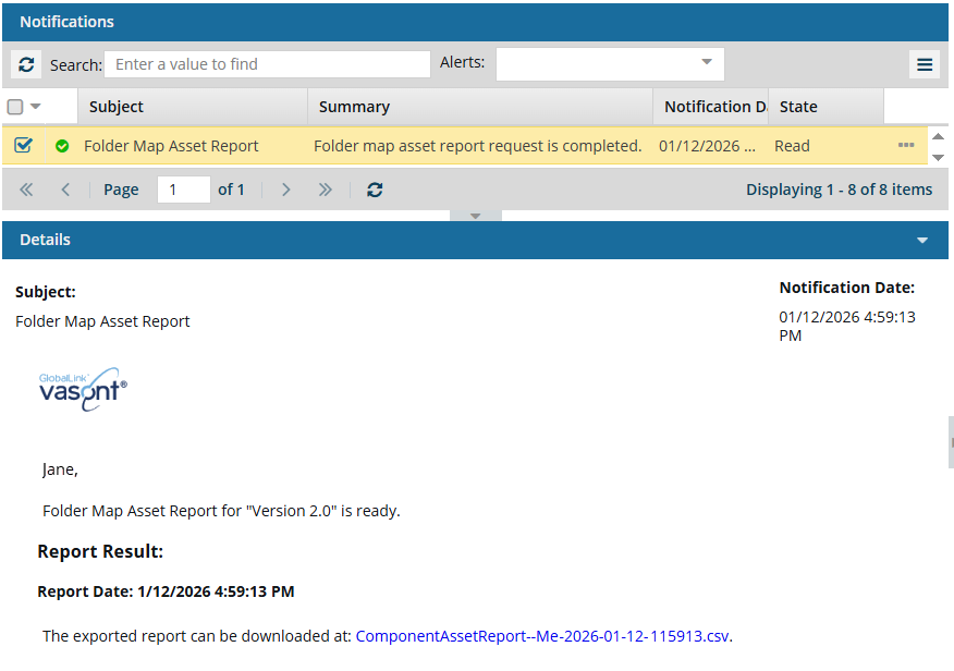 From the list of notifications, select the one that says Folder Map Asset Report.