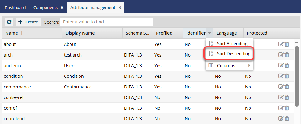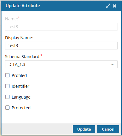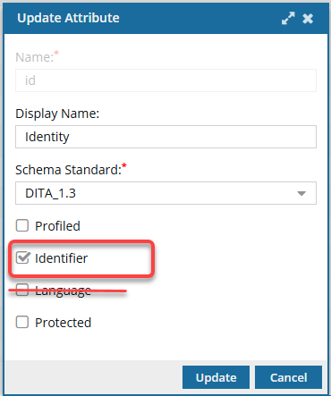 <id>). - If you want to create your own component identifier attribute for DITA, you must update the default attribute to clear the Identifier option.