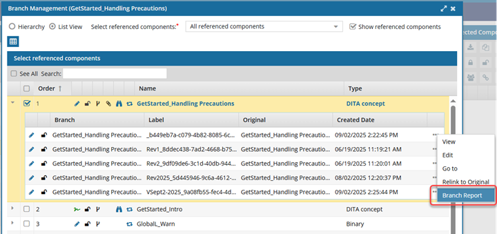 When you branch a component, you can choose if the branch maintains all, some, or no content referenced in the source component. In the Branch Management tool, you can select a component that is included in a branch and see what other branches it's used in. To create a report about this branched component's relationship in another branch, you can use the Branch Management tool.