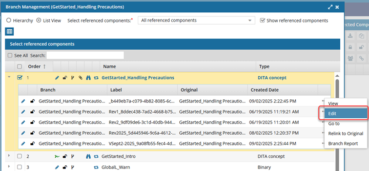 These steps explain how to open a branched component for editing in the List view. You can also Edit a branched component in the Hierarchy view.