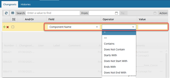 - Contains: show only changeset records where the Component Name has some of the characters you entered in Value