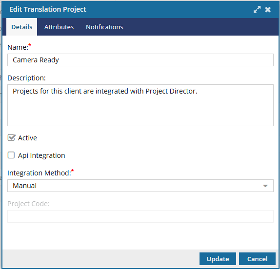 From the list of translation project attributes, select the attribute that you want to update and click Update