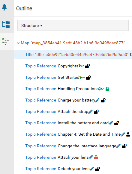 - Open the Components browser: In the Oxygen map Outline panel, right-click the topic, use the Go to option to open the Components browser, find the highlighted topic, and unlock it by: