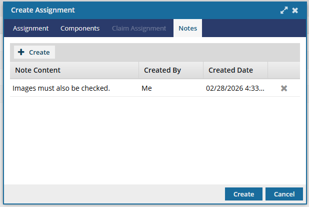 - When you click Create, the Project Assignment Note screen opens.