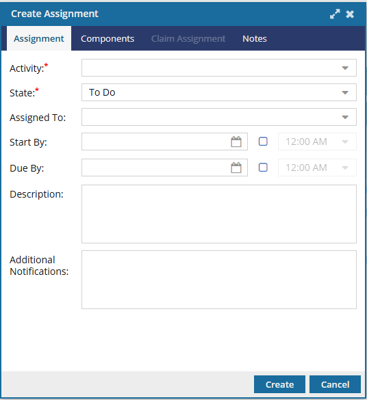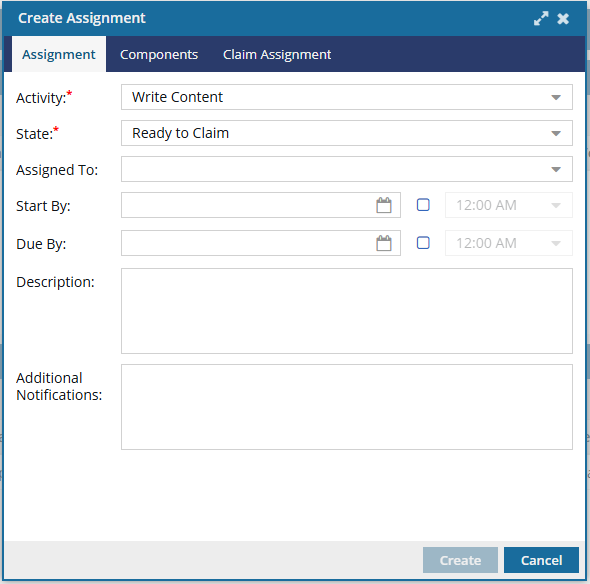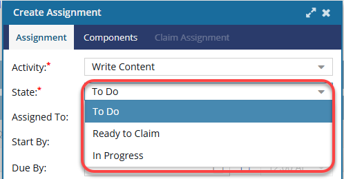 - Ready to Claim: In this State, no specific user has been assigned to complete the work. Instead, a list of possible users was identified and they are all notified that the assignment can be claimed. The first user to claim the assignment by setting the State to In Progress can complete the work. This option to make an assignment Claimable is available when working with project assignments and workflow activities. For more details, read: