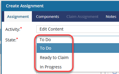 When you create an assignment, you can select only To Do, Ready to Claim, or In Progress. States are designed to be used in the following order: