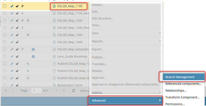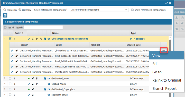 After you create a branch, you can see the list of referenced components in the Branch Management tool. If a referenced topic is also part of another branch, you can see them using the expand arrow.