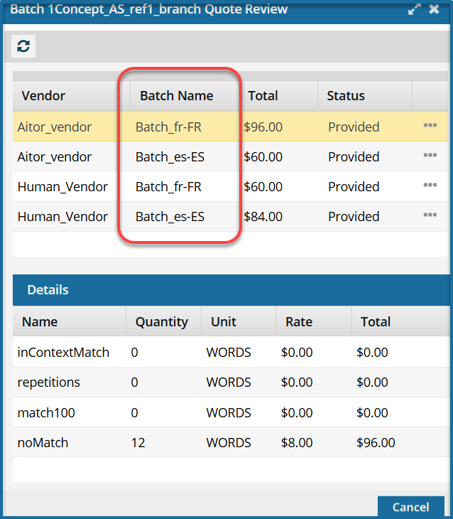 For example, you can't approve the cost for 100% matches (match100) and not approve the cost for 0% matches (noMatch). You can only approve the quote for Human_Vendor.