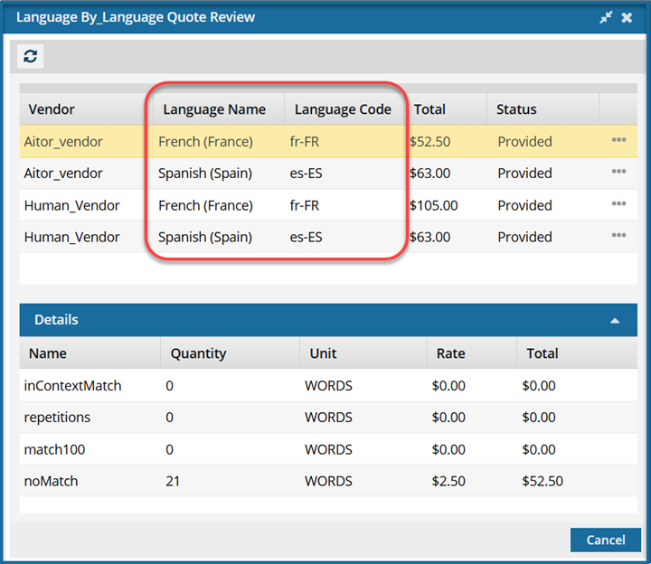 Review a quote for a translation job - You must approve at least one quote in Inspire before a translation job can be started and the translation work can begin in GlobalLink Enterprise.