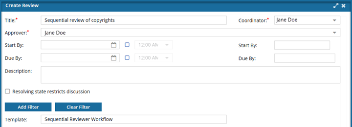 - Restrictions. By default, Resolving state restricts discussion is not selected. If you want you can restrict work in the Collaboration panel when a review has a State of Resolving, you can select this option