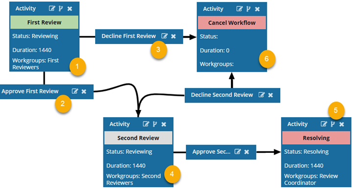 - If users in the Workgroups: Second Reviewers or the coordinator chooses to Decline Second Review, then Inspire moves the workflow to the linked Activity: Cancel Review.