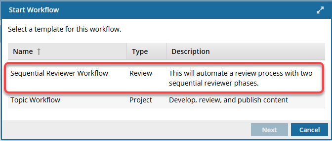 Inspire provides you with a template for the process of getting reviews on content from two users. The reviews in this template don't occur at the same time. Instead, one or more reviewers are assigned to the first phase, and when they complete their review, Inspire assigns a review to the second set of reviewers.