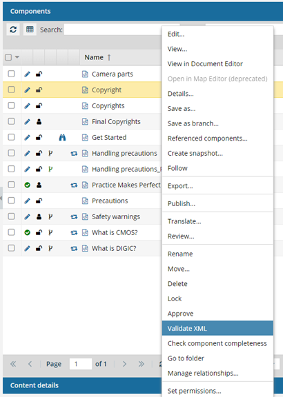 Components Browser optionsAuthors can ensure their content is structured correctly or view a list of errors if validation fails from the components browser without opening the component in the Oxygen editor. Using the right-click or context menu
