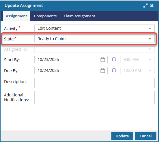 - Ready to Claim: In this State, no specific user has been assigned to complete the work. Instead, a list of possible users was identified and they are all notified that the assignment can be claimed. The first user to claim the assignment by setting the State to In Progress can complete the work.