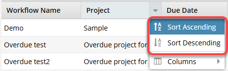 - Column heading. In the title of a column you can sort by, use the arrow graphic next to the column name to sort in the following ways: