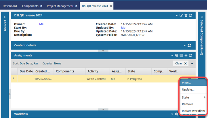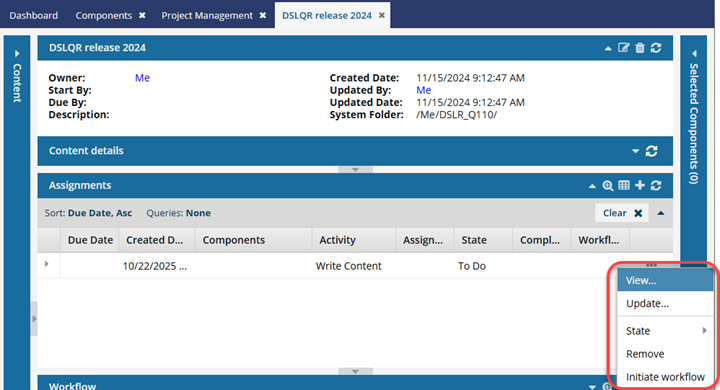 In this State, the assignment exists as a placeholder. You do not have to assign a user to complete the assignment or add any components. A project owner or user with permissions can take the following actions on an assignment in this state: