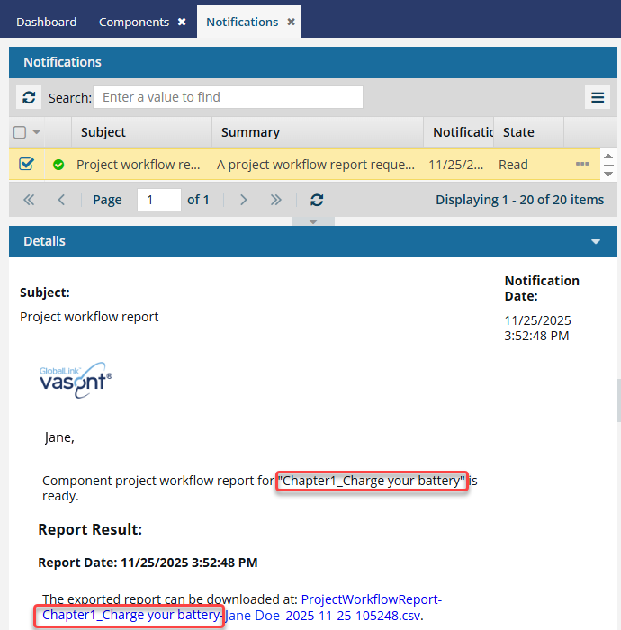 8. To see the report, click the download link provided in the notification, and then open the file from your local computer.