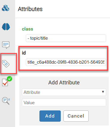 You can edit Inspire components in an XML editor that uses Oxygen functionality. When you're working on a document in the Oxygen-based editor, you can provide extra information about an element in the Attributes pane. For example, if you insert an image element, you can add an attribute to specify that the alignment of the image on the page should be in the center. After you add an attribute, you can go back and change the value specified in the attribute or delete the attribute. Deleting an attribute doesn't delete the element.