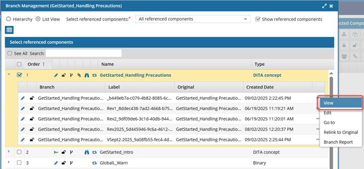 After you create a branch, you can see the list of referenced components in the Branch Management tool. If a referenced topic is also part of another branch, you can quickly open a read-only copy if it.