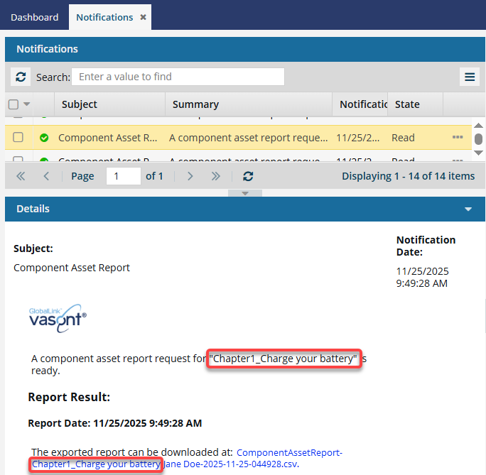 From the list of notifications, select the one with a Subject of Component Asset Report.