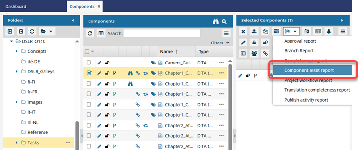 You can select a component and create a report to see all of the component's references, including links to other topics, content references to elements in other topics, file and web links, and inserted images. If the component is a map, you can also see references to other maps.