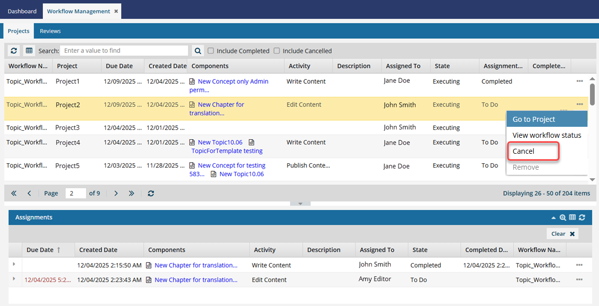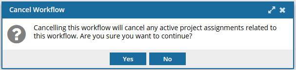 You can cancel an active workflow in a project to stop it progressing to any remaining tasks or assignments in the workflow.
