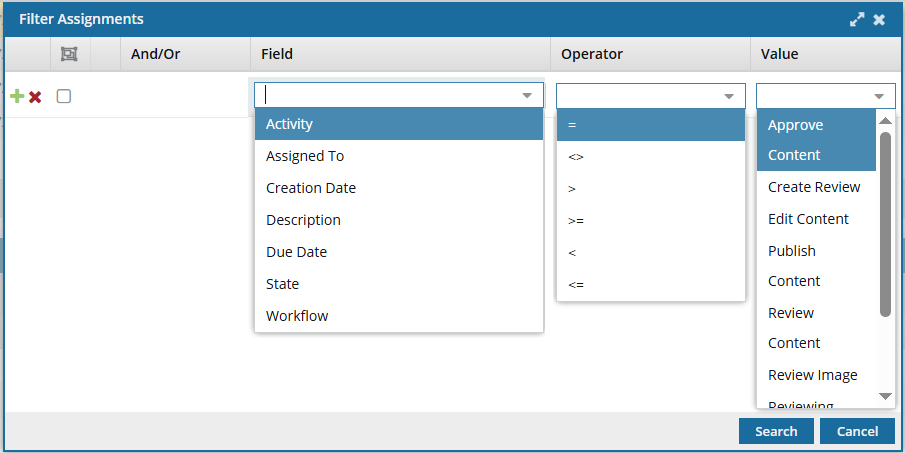 In the Field list, select the assignment detail you want to search by.