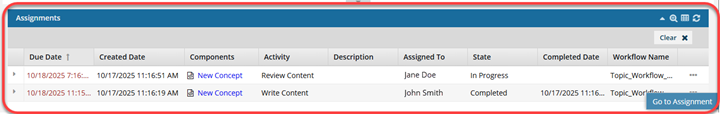 - On both tabs you can see details about the assignment in the workflow, sort the list, search for an assignment, and filter the list.