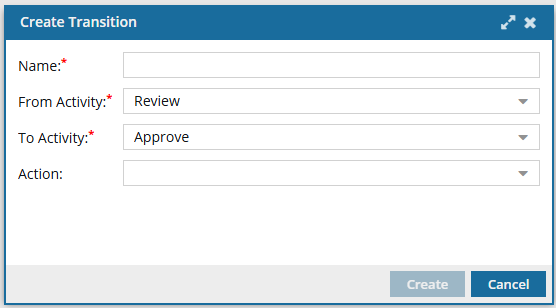 You use Transitions to define what the next step in the workflow is and what needs to be done before starting that next step. To add an approval action to a new transition, you must have created the two Activities that the transition is connecting. A transition can only be created from an Activity's toolbar.