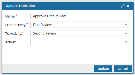 In Action, you can identify a process that is completed outside of Inspire, such as Hire a copy editor. You can also use an Action to specify something a user should do after Inspire completes the transition, such as Take a snapshot.