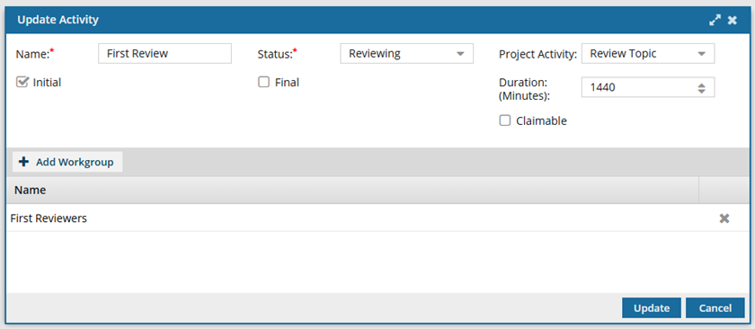 In the workflow editor, you specify the Activity that needs to be done, such as completing a technical review, an editorial review, or a legal review.