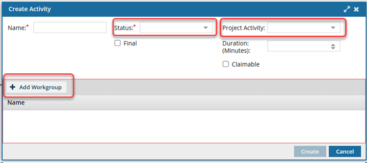 For Activity configurations, you should build the options you need for Status, Project Activity, and Workgroup.