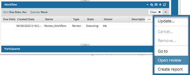 After you open a project, you can go to the workflow pane, and for any review workflow use the Options menu to open the review editor to select a topic and review it.