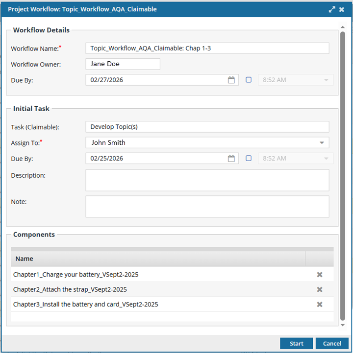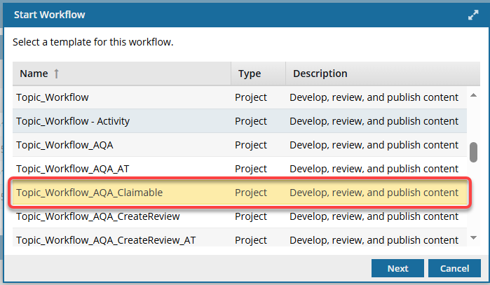 If you want to start a content development workflow by first selecting the project components you need to include, you can start the workflow from the project's Selected Components panel. Then you must select the template that contains the process you want to use. Finally you add the due dates, and assign the initial task.