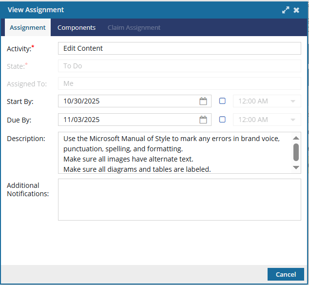 After you have been assigned work to do, you can use the assignment details to understand what you need to do to complete assignment.