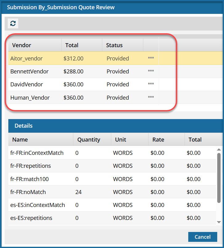 If you are using multiple vendors, a vendor can only begin work if you approve the quote. Not approving a quote for a vendor may result in a translation job being only partially completed. You may have to Force complete the job and resubmit a new translation job for the language or vendors who quote you did not approve.