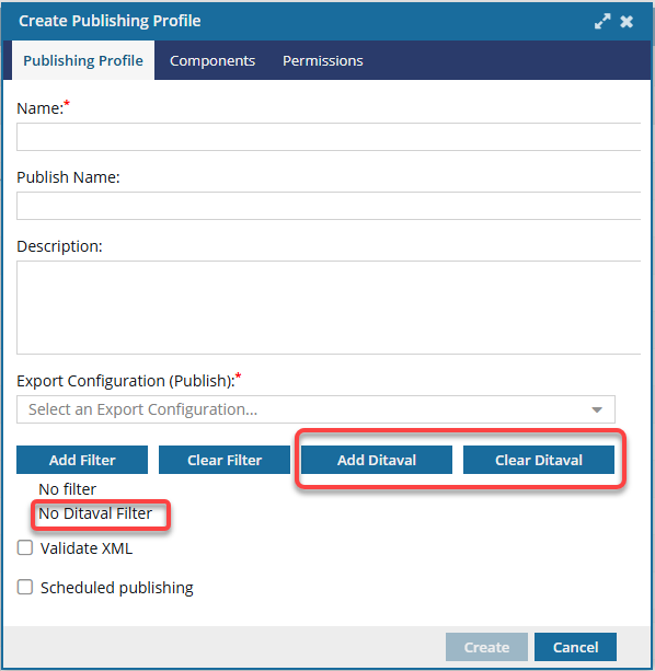 You can create publishing profiles to make it easier to publish content. A publishing profile lets you specify one or more components, an export configuration, filters, validation and scheduling options once so that you can use it repeatedly. You can also use a publishing profile to schedule one publishing event in the future. This lets you schedule components to be published at a later date without having to remember to come back and manually publish the components. You can also publish only once on demand, and it occurs right away.