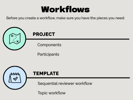 For steps on how to add content, read Add existing components to a project. - Participants. Make sure the users who you want to work on the tasks in a workflow are added to your project.